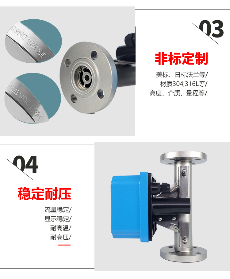 可带背光 单轴灵敏指示;非接触磁耦合传动;金属管浮子流量计全金属结构,适于高温、高 压和强腐蚀性介质;可用于易燃。